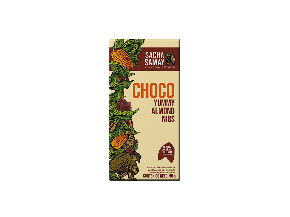 Chocolate ecuatoriano elaborado desde el alma de la selva, combinando cacao con leche, trozos de almendra y nibs de cacao. Cada barra ofrece una experiencia de textura crujiente y sabor suave, reflejando calidad, sostenibilidad y pasión por la naturaleza. Producto de pequeños agricultores, cada bocado conecta con el origen del cacao ecuatoriano. Desde el alma de la selva con un toque de amor.