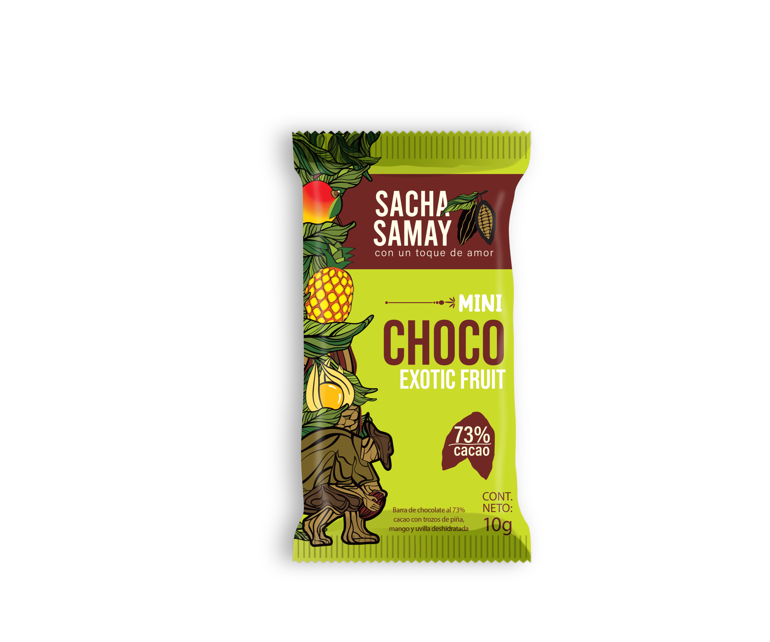 Chocolates ecuatorianos elaborados desde el alma de la selva, combinando cacao 73% con trozos de piña, mango y uvilla deshidratada. Cada barra ofrece un equilibrio perfecto de dulzor y acidez natural, con notas frutales que despiertan los sentidos. Producto de pequeños agricultores del Salto del Tigre, refleja calidad, sostenibilidad y pasión por la naturaleza en cada bocado. Desde el alma de la selva con un toque de amor.
